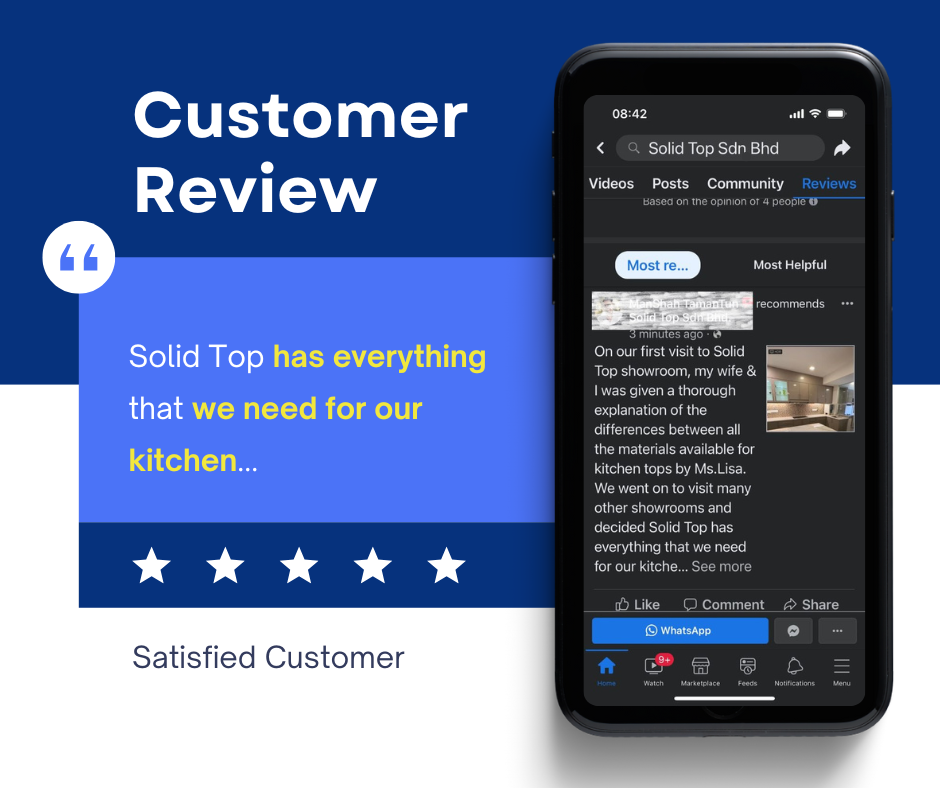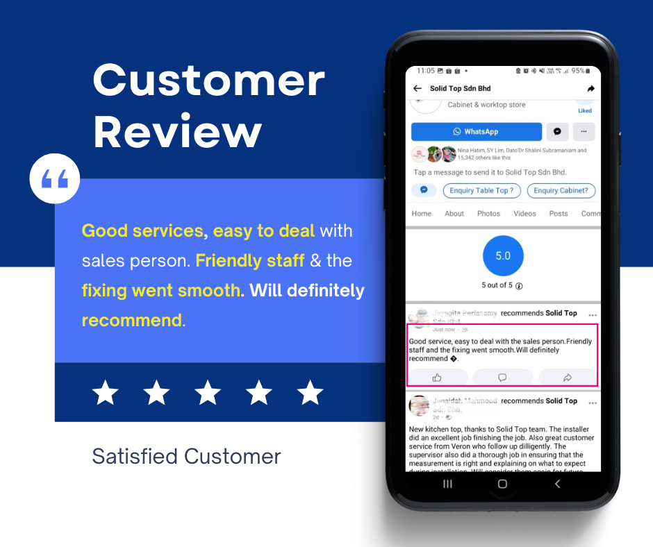 We provide you with high-quality quartz countertop solutions. If you want to purchase Jess Stone Quartz, be sure to buy directly from Solid Top Sdn. Bhd.